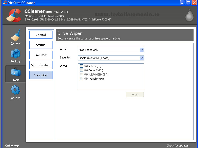 e) Drive Wiper – ne faciliteaza sa stergem spatiul liber de pe disc prin mai multe metode de securitate. Banuiesc ca ghiciti de ce? Sa nu se mai poata recupera datele de pe hard disc, mai ales daca planuim sa-l vindem! Insa programul nu se opreste si ne mai ofera posibilitatea de a sterge toate datele de pe o partitie (exceptie cea pe care este sistemul de operare). Asadar atentie sporita cand folositi unealta Drive Wiper!
