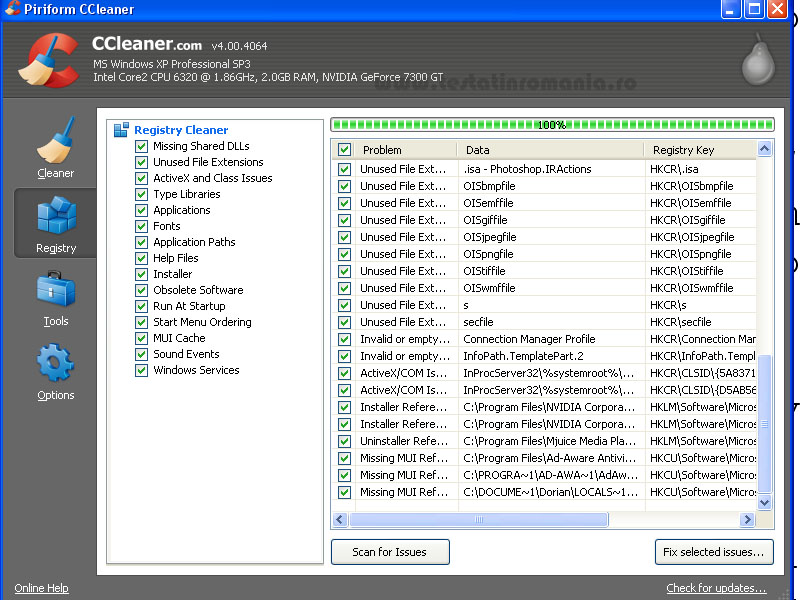 Scaneaza registrul din sistemul de operare Windows si sterge inregistrarile care sunt inutile. Inainte de acest proces putem face o salvare de siguranta (backup) daca nu avem incredere in CCleaner, sau daca avem unele dubii.