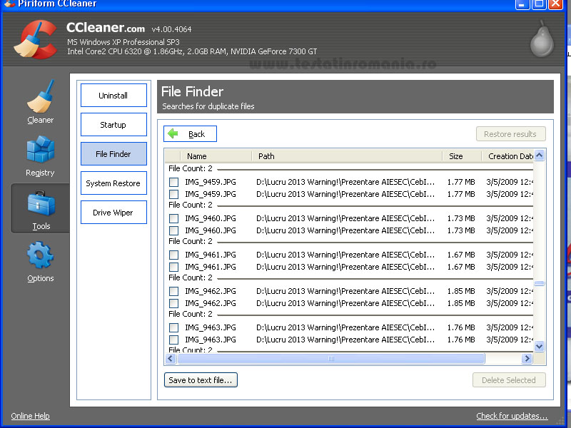 c) Unealta File Finder, este o noua „vitamina” in CCleaner, pe scurt ea ne ajuta sa gasim fisierele care sunt identice pe hard disc si sa le stergem. Din nou o modalitate de a elibera spatiul pe disc ocupat fara niciun sens!