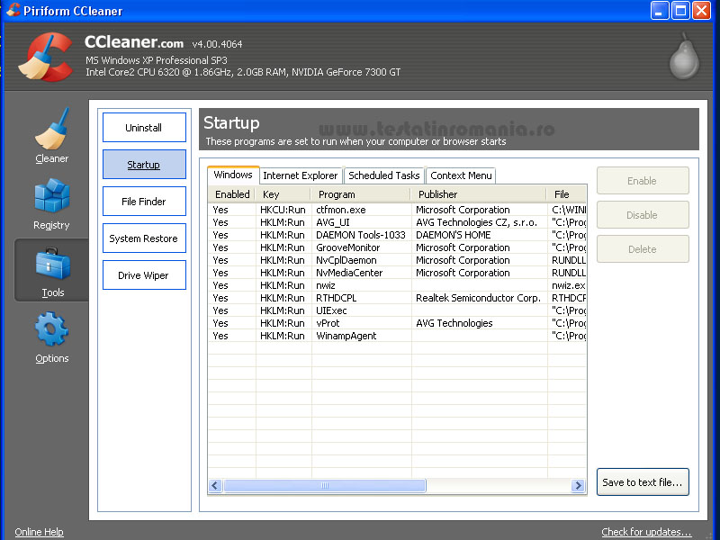 b) In Startup, putem seta care programe din Windows sa porneasca sa nu odata cu sistemul de operare. Mai putem „regla” „Context Menu”, spre exemplu sa adaugam un fisier mp3 in lista de rulare a programului Winamp. De asemenea, mai putem edita sarcinile programate, extensiile din Internet Explorer etc.