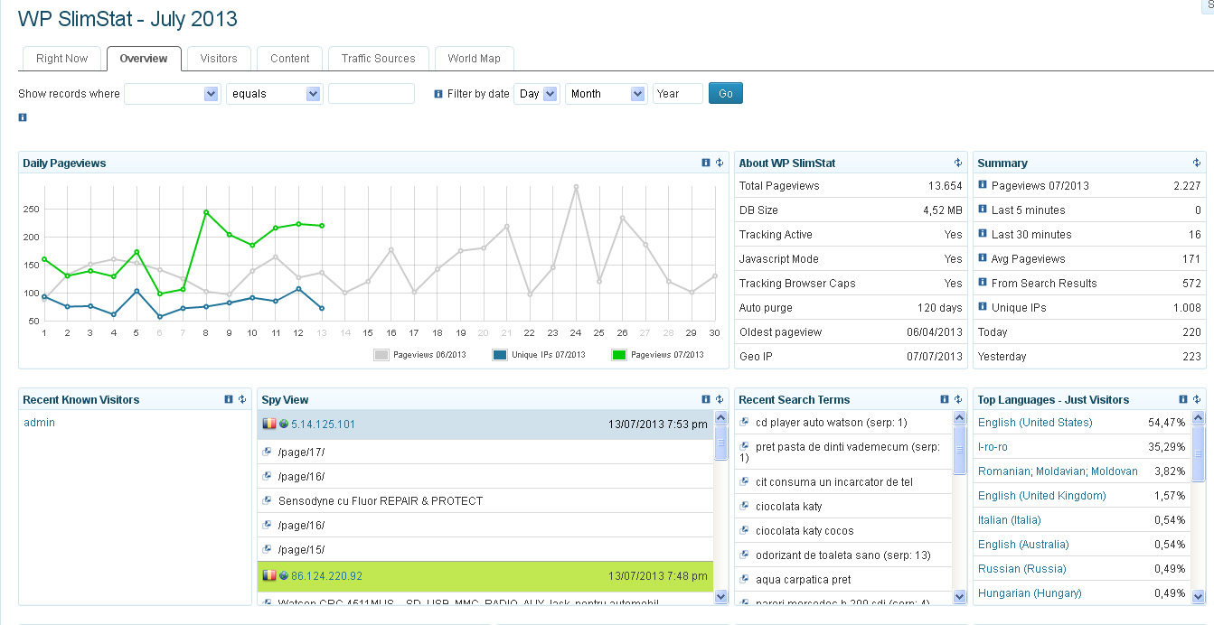 Ultimul, dar nu ultimul. Sunt convins ca vrei sa stii care este numarul persoanelor care iti viziteaza site-ul. Plugin-ul WP SlimStat, iti ofera o statistica fantastica, este un plugin compact si fata de altele pe care le-am incercat WP SlimStat nu iti incarca inutil platforma Worpress. Chiar am testat la un moment dat un alt program de statistica, si mi-a blocat site-ul pentru o zi. A fost destul de neplacut. Pe WP SlimStat il testez de cateva luni de zile si totul este in regula, iar baza de date are doar 3,5 MB. In plus, prin intermediul statisticilor, afli ce subiecte se viziteaza si cum s-a ajuns la acele subiecte prin intermediul motoarelor de cautare. Te ajuta, spre exemplu, sa dezvolti subiectele care sunt cele mai citite.
