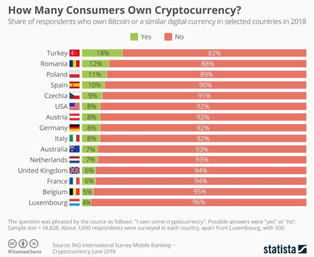Conform unui studiului Statista efectuat pe 15.000 de persoane, Turcia are în prezent cel mai mare număr de persoane care dețin criptomonede. Astfel, 18% dintre respondenții studiului au spus că dețin bitcoin sau alte criptomonede.