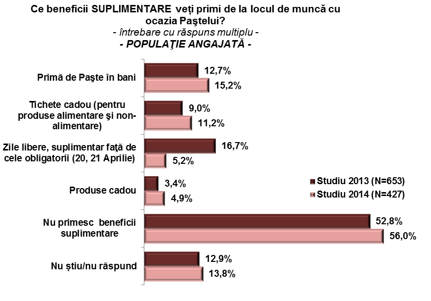 De asemenea, comparativ cu anul 2013, angajatorii rămân, în general, la fel de reținuți în a acorda beneficii suplimentare cu ocazia Sărbătorilor Pascale.