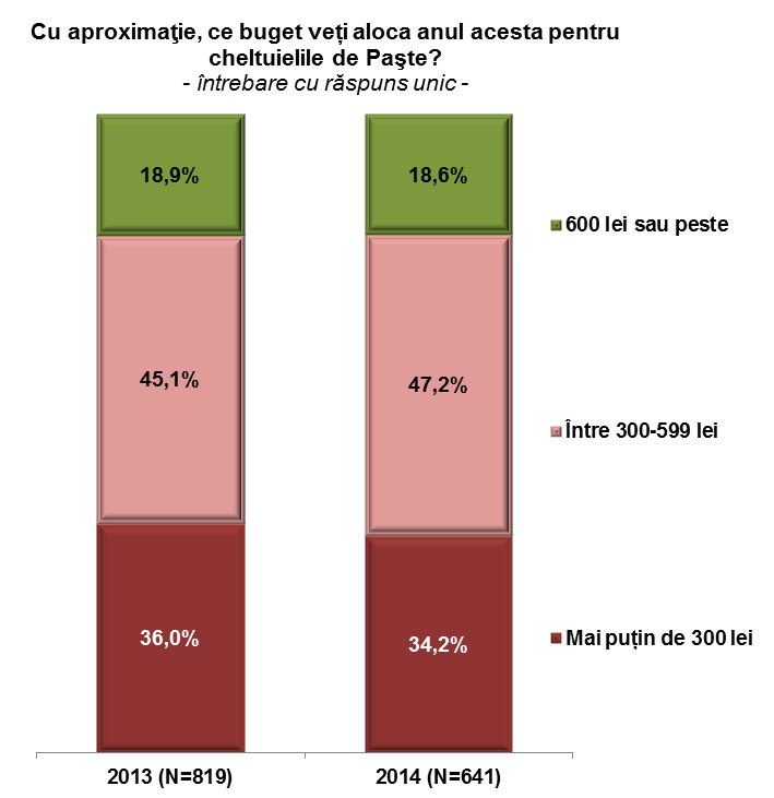Comparativ cu anul trecut, bugetul mediu alocat sărbătoririi Paștelui nu a crescut semnificativ din punct de vedere statistic, suma medie situându-se în jurul valorii de 359 lei în 2014, față de 358 lei în 2013.