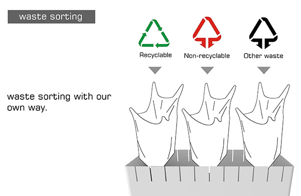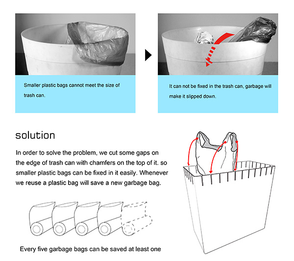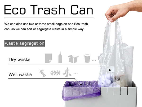 Eco Trash Can, este un coș de gunoi cu un design simplu, dar care facilitează să folosim eficient orice pungă de plastic! Coșul are la gât mai multe fante care ne permit să montăm doua pungi, spre exemplu una pentru deșeurile ude și una pentru cele uscate. Sau putem să folosim orice pungă care nu ne mai trebuie, pungă care va fi fixată perfect în Eco Trash Can. Sursa.
