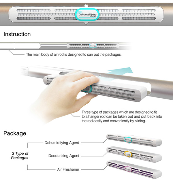 Dezumidificatorul Air Rod este un cuier performant pentru haine curate și aerisite. Cuierul are elemente care odata ce se consumă se pot schimba cu ușurință. Printre accesoriile integrate în cuier se enumeră dezumidificator, odorizant șî „Air Freshener”. Probabil pe viitor se va putea integra si un accesoriu anti-molii. Dar asta rămâne de văzut.