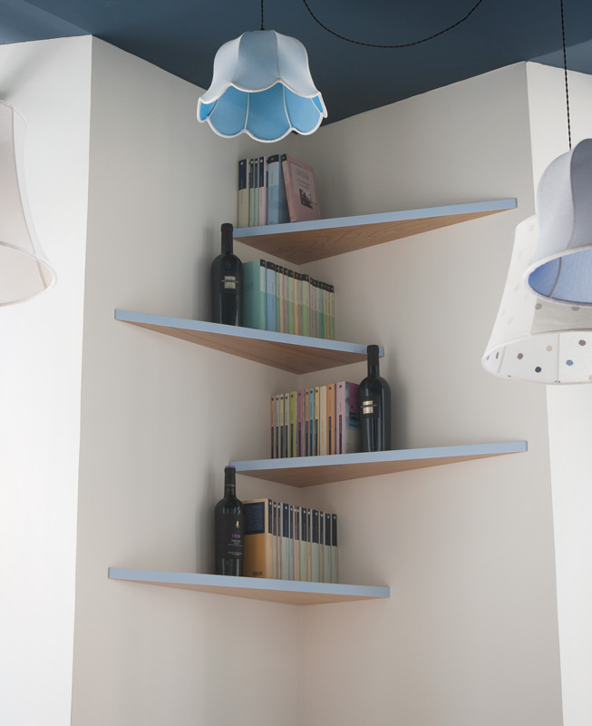 Mai jos găsim o bibliotecă creată virtual pe un colț de cameră care nu avea nicio utilitate. Rafturile au forma unui triunghi dreptunghic.