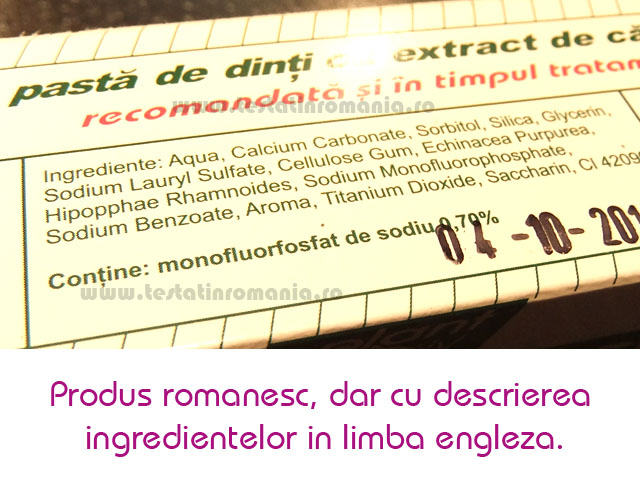 Etera este o pasta de dinti romaneasca. Ambalajul este de calitate, fapt ce demonstreaza ca producatorul Etera Prod, a fost atent la toate detaliile (exceptia: la descrierea ingredientelor care a fost uitata in limba engleza). Pasta de dinti nu contine mentol si camfor. Costa 3,21 lei cu TVA* si ma bucur ca, Kaufland Romania, ii promoveaza pe producatorii romani. Producatorul recomanda pasta de dinti si in timpul tratamentelor homeopate. Termenul de expirare al produsului este de cca. 2 ani. Dar sa vedem ce Contine pasta de dinti.