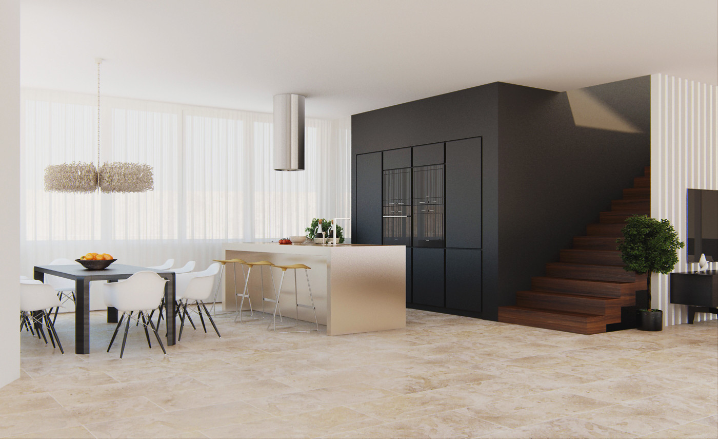 În vecinătatea camerei de zi, găsim bucătăria. Locul de servit masa este iluminat de un corp „pufos”, care este compus din multe bucăți de sârmă. Electrocasnicele și alte dulapuri sunt ascunse în perete, iar hota este piesa care inspiră mult rafinament în bucătărie. În casă, observăm pe alocuri, dulapuri ascunse în perete.