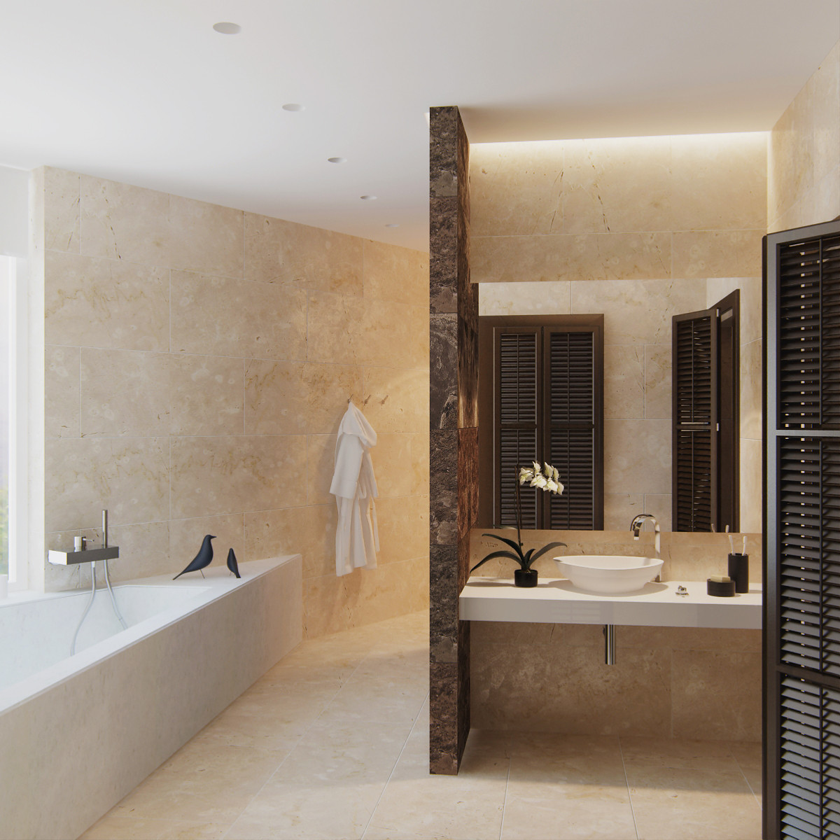 Băile dispun de culori calde, unde predomină lumina indirectă similar cu dormitorul, iar oglinda plină de cerculețe a fost pusă cu bună știință ca să relaxeze sexul frumos, care, probabil se va machia în fiecare dimineață.