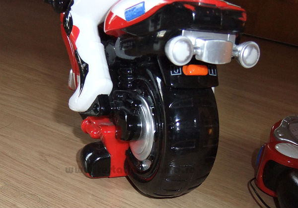 Telecomanda însă are mai multe probleme. În primul rând s-a rupt antena, deci producătorul ar putea gândi pe viitor spre exemplu, un design care să integreze antena în corpul telecomenzii! Butoanele telecomenzii se apasă cu o oarecare ușurință, însă construcția lor nu este potrivită pentru un copil de 3 ani. Astfel, butonul care controlează direcția motocicletei are un rol dublu, asigurând deplasarea în stânga cât și în dreapta. Astfel, uneori copilul va apăsa din greșeală în direcția opusă. La fel se întâmplă și cu butonul care asigură deplasarea în față și în spate. Bateriile din telecomandă i-au asigurat o autonomie de cca. 6 luni.