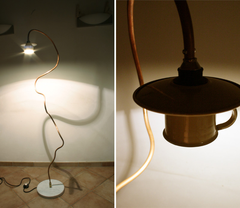 Așadar a găsit o bucată de marmură rotundă pe care a găurit-o, a strâmbat o țeavă de cupru după bunul plac, și în vărf i-a adăugat o cană cu farfurie – unde a montat becul. Rezultatul final este unul fascinant, dar depinde din ce unghi privești lampa!