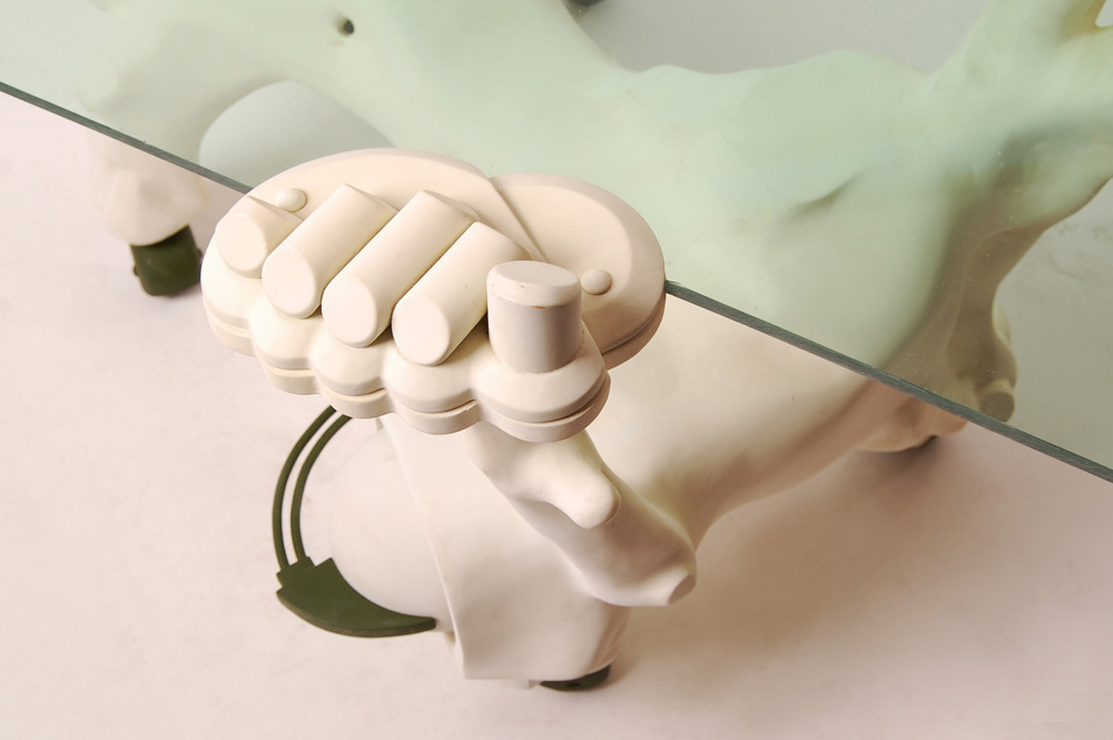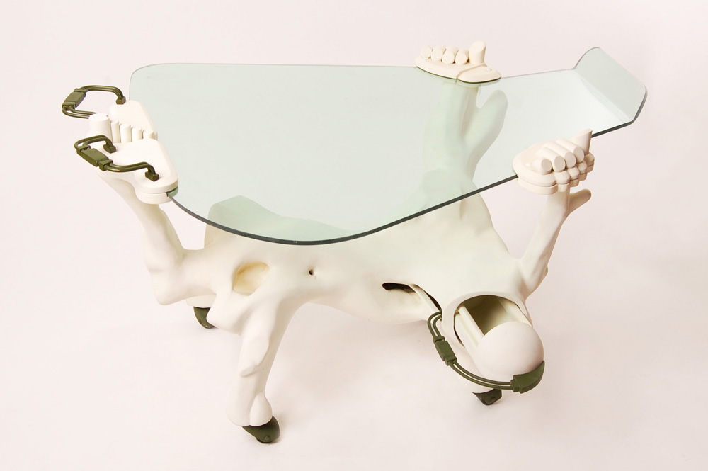 Victor Puzur a creat o masă ciudată, care la prima vedere pare formată dintr-un schelet uman.