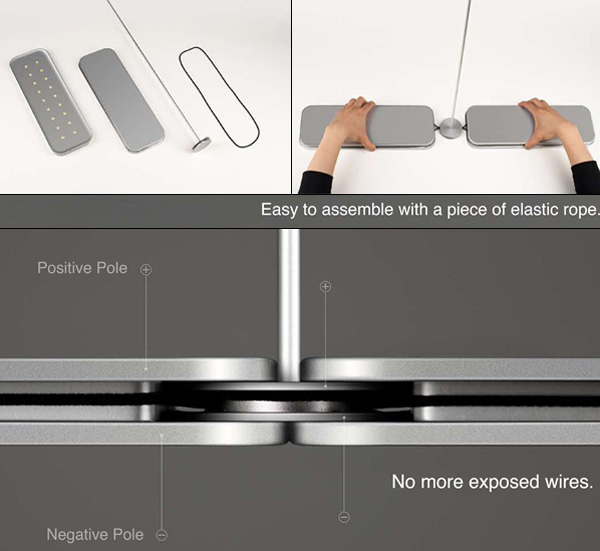 Astfel, circuitul electric este asigurat prin conectarea lămpilor între ele. Datorită faptului că folosește o sursă de iluminat cu LED-uri, lămpile au nevoie de o sursă de curent cu tensiune foarte mică astfel, oamenii pot atinge lampa chiar și când este pusă în funcțiune, fără să le fie frică că se vor curenta. Avantajul lămpii P.Lamp este că își poate schimba forma pentru că nu este limitată de tradiționale cabluri. Sursa.
