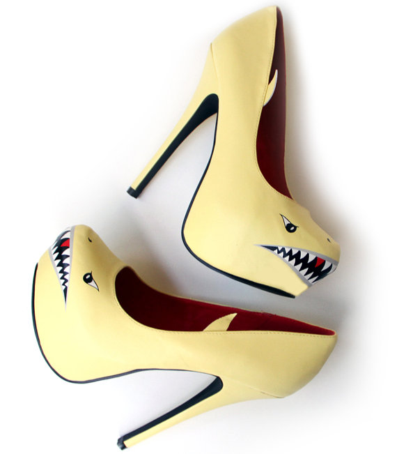 Etsy este un magazin online în care găsiţi idei inovatoare, concepte pe care nu vi le-aţi imaginat vreodată. Alăturat vedem o pereche de pantofi cu toc înalt a cărui vârf au fost vopsiţi cu dinţii şi ochii unui rechin. Simpatici, sau nu, nu mai contează, aşa ceva nu am văzut până acum. Pe de altă parte nu cred că este mare lucru să îţi cumperi mai multe abţibilduri şi să-ţi modifici o pereche de pantofi cu toc din garderobă asemanator celor din imagini.