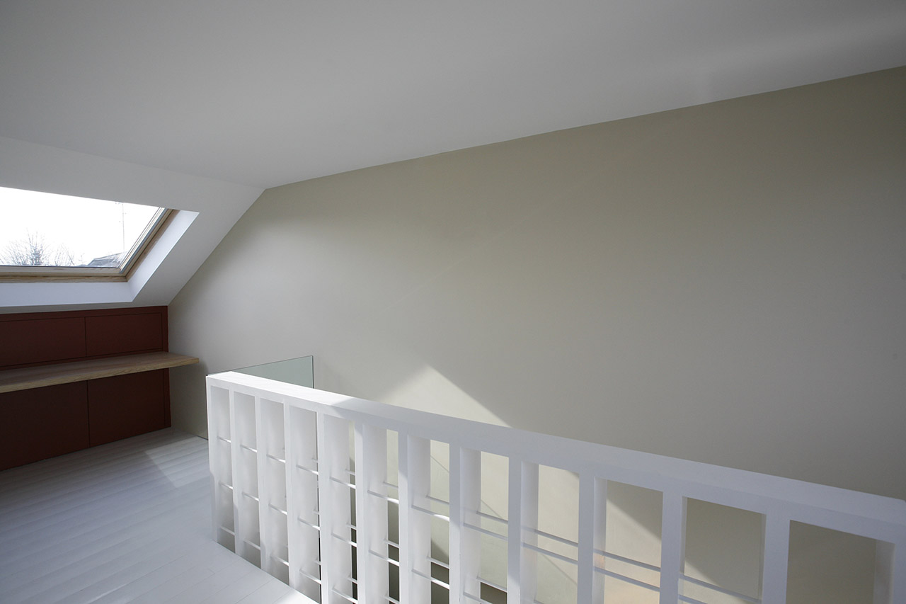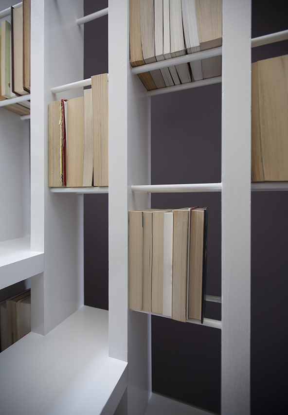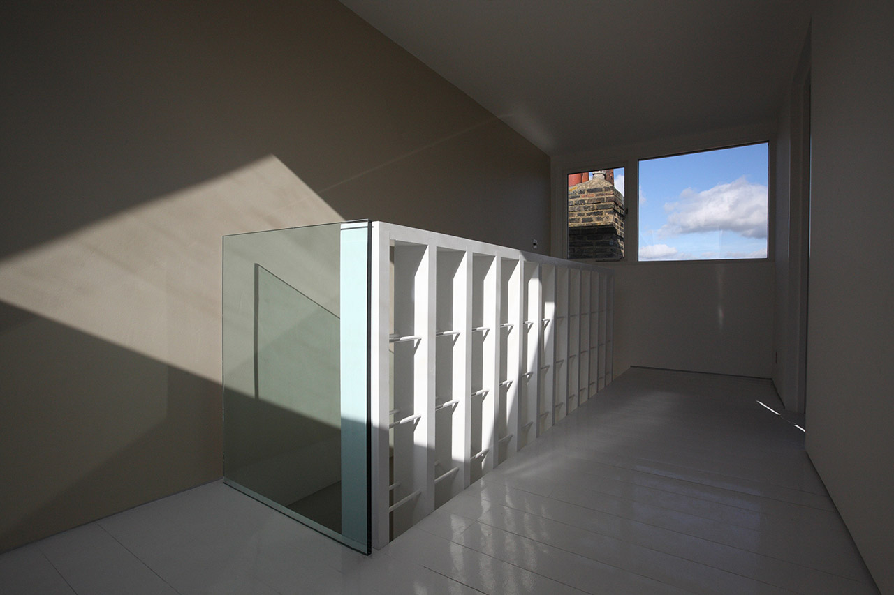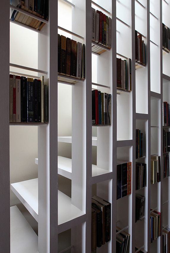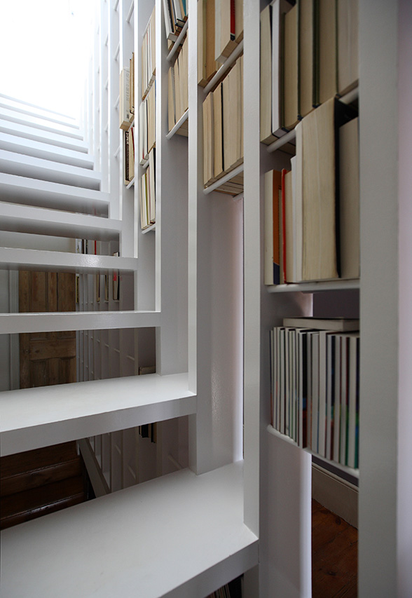 Așadar vrem, nu vrem, de scări avem nevoie. Însă designerul Tamir Addadi a fost provocat să dezvolte soluție ieftină pentru o casă privată din Anglia. Soluția hibridă oferită de Tamir, a fost o scară a cărei „balustrade” este o biblioteca pentru cărți. Rafturile bibliotecii sunt formate din două „țevi” care fac ca locul strâmt să se simtă aerisit. La etaj, intrarea spre scară este protejată dintr-o ușă din complet din sticlă. Treptele scării sunt „prinse” în rafturile bibliotecii și îți lasă impresia că „plutesc”!