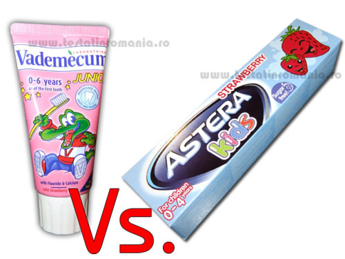 Ei bine am ajuns la punctul cel mai sensibil. Marca Vademecum este cunoscuta publicului larg pentru ca a beneficiat de multa mediatizare la TV. Marca Astera kids are un deficit in sensul mediatizarii. Cantitatea de pasta de dinti continuta de ambele produse din teste este la fel, de 50 ml, pretul celor doua produse este complet diferit. Vademecum Junior costa* 5,99 lei cu TVA, iar Astera kids costa* 3,49 lei cu TVA.