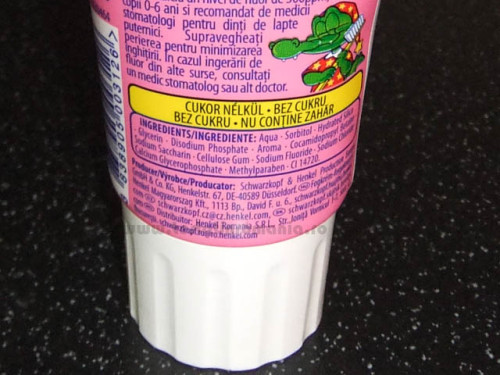 Pasta de dinti pentru copii pentru protectie completa impotriva cariilor si a placii. Contine calciu un nivel de fluor de 500 ppm, adecvat pentru copii 0-6 ani si recomandat de medicii stomatologi pentru dinti de lapte puternici. Supravegheati perierea pentru minimizarea inghitirii. In cazul ingerarii de fluor din alte surse, consultati medicul stomatolog sau alt doctor. Producator: Schwarzkopf & Henkel Production Europe GmbH & Co. KG, Henkelstr. 67, DE-40589 Dusseldorf. Distribuitor Henkel Romania S.R.L., str. Ionita Vornicul 1-7, Sector 2, Bucuresti, schwarzkopf.ro@ro.henkel.com