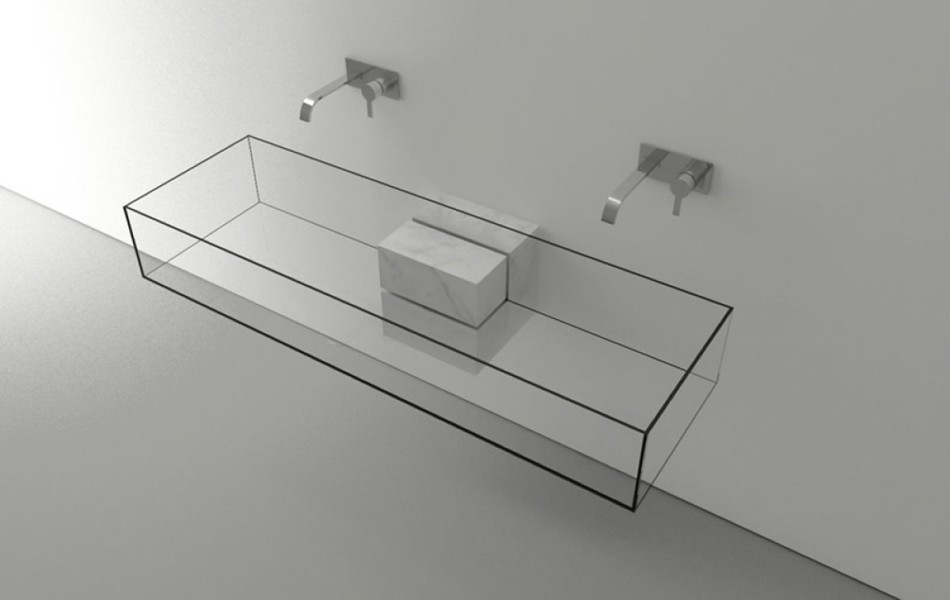 Piatra care susține chiuveta dreptunghiulară din sticlă este din marmură, iar sistemul de prindere este ascuns cu o subtilitate de invidiat. La fel ca și chiuveta, robinetul are un design minim care se încadrează perfect. Proiectul este disponibil și în varianta pentru două persoane, dar versiunea „single” poate conține adițional două sertare care sunt aproape identice cu piatra cubică care susține chiuveta transparentă. Sursa.